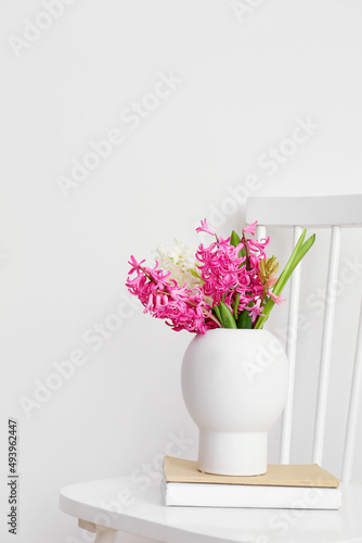 8, anniversary, background, beautiful, birthday, blooming, book, bouquet, celebration, chair, closeup, colours, day, decor, design, elegance, event, floral, flower, fresh, gift, holiday, hyacinth, interior, march, modern, natural, nobody, object, pink, present, romantic, room, season, spring, style, vase, wall, white