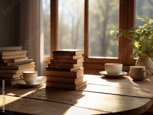 interior, room, wood, stair, home, wooden, empty, house, design, book, window, table, light, sunlight, morning, closeup, mug, warmth, ambience, calmness, minimalism, peaceful, copy space