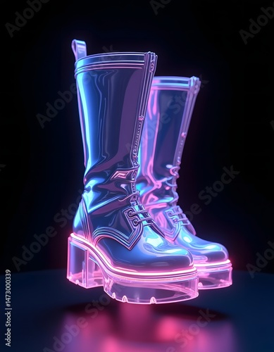 boot, shine, transparent, glow, neon, lace, reflect, stylish, futuristic, modern, studio, dark, vibrant, digital, night, fashion, style, design, wear