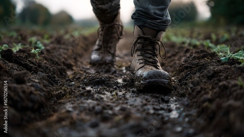 Boots traversing through muddy garden rows