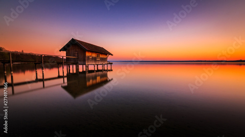 Bootshaus in Stegen am Ammersee bei Sonnenuntergang in Bayern Deutschland