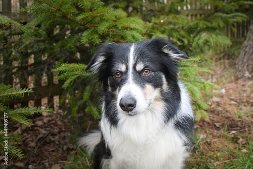 Border collie is sitting in the bush. Autumn photoshooting in park.