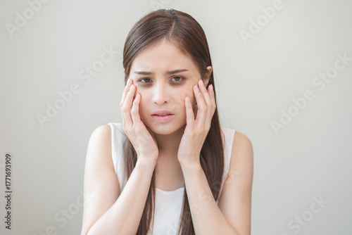 Bored, insomnia asian young woman, girl looking at camera, hand touching under eyes with problem of black circles or panda puffy, swollen and wrinkle on face. Sleepless, sleepy healthcare person.