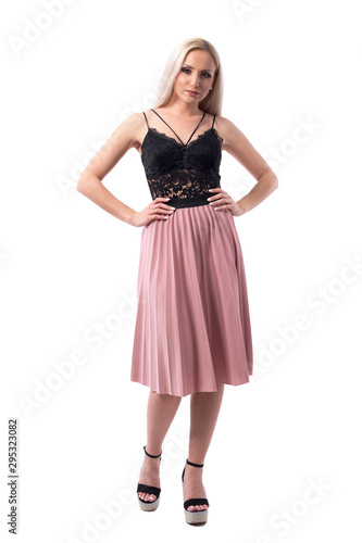 woman, fashion, serious, attitude, defiant, sceptical, unconvinced, uncertain, distrustful, isolated, white background, full body, young, skirt, well-dressed, style, evening dress, elegant, classic, posh, full-length, studio, blond, attractive, beautiful, femininity, pleated, lace, sandal, summer, platform, clothes, vogue, standing, luxury, youth, pretty, pink, female, people, straight hair, black, front view, posing, fashion model, displeased, expression, stylish