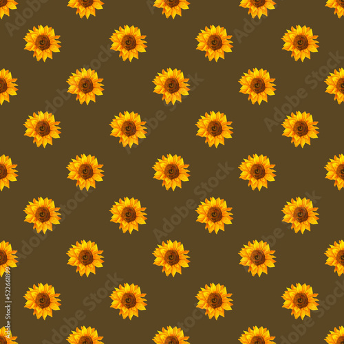 Botanical floral seamless pattern, wild meadow sunflower isolated on brown background, for book, cover, banner, textile, packaging. Flowers, buds and leaves. Watercolor hand drawn illustration