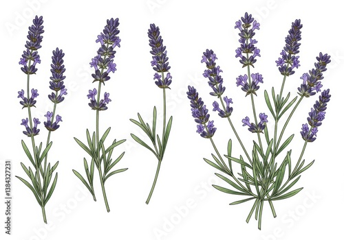 Botanical illustration lavender sprigs purple flowers green leaves white background