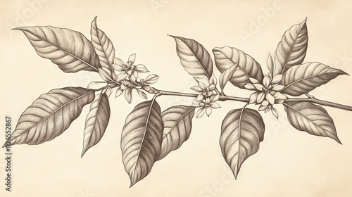 botanical, illustration, hot drink, plant, tree branch, detailed, line, art, broad, leaf, prominent, vein, small, flower, shading, technique, sepia, toned, background, vintage, engraving, style, high, contrast, ink, drawing
