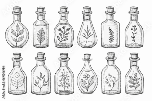 bottle, plant, leaf, glasses, vignetting, botanical, specimen, pattern, seamless, vintage, drawing, illustration, herb, natural, organic, element, design, art, artwork, decorative, transparent, container, cork, old, style, graphic, outline, line, ink, hand-drawn, collection, set, nature, floral, tree branch, stem, flower, potion, medicine, apothecary, retro, antique, ampoule, alchemy, science, biology, herbarium, foliage