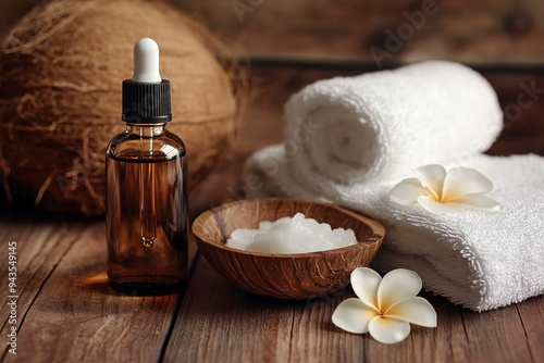 Bottle and bowl of coconut cosmetic oil and bath towel on brown wooden background. Generative Ai