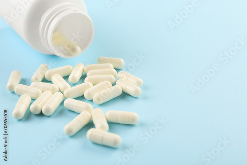 Bottle and vitamin capsules on light blue background, closeup. Space for text