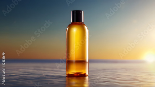 Bottle for cosmetic tanning tanning oil against the backdrop of the sea and sunset summer theme seaside holiday