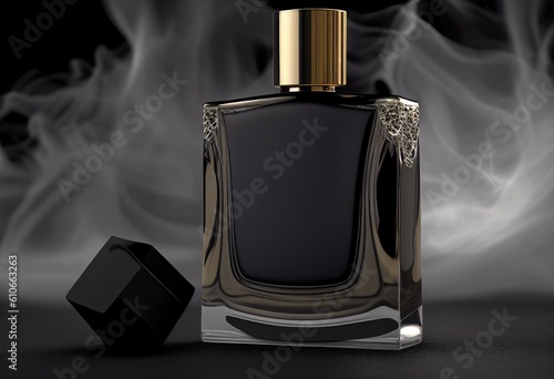 Bottle of perfume with smoke in the dark background. Generative AI.