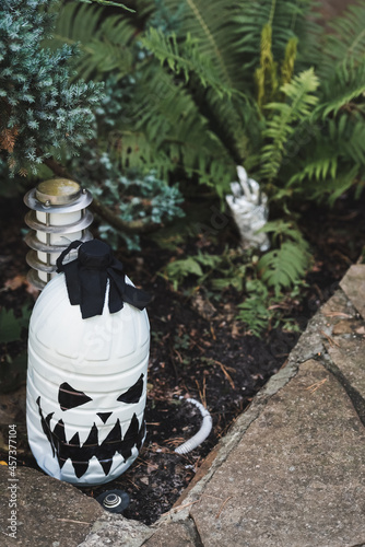 green, painting, celebration, decoration, event, festive, holiday, season, outdoors, garden, autumn, plant, fall, october, painted, bottle, lantern, outside, scarey, halloween, skittish, juniper, daytime, backyard, fern, creepy