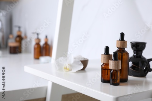 Bottles of essential oil on white shelf in bathroom. Space for text