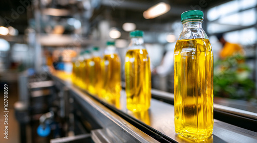 Bottles of olive oil on a production line, showcasing the bottling process in a factory setting, with metallic surfaces and machinery in the background, highlighting industrial efficiency