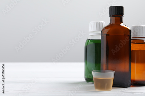 Bottles of syrup and measuring cup on white table against light grey background, space for text. Cold medicine