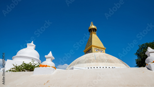 Boudhanath stupa in Kathmandu, Nepal. The top has been rebuilt since 2015 Nepal earthquake.