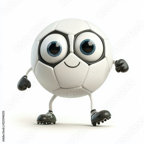 Bouncy soccer ball character with sporty eyes, arms, and legs ready to kick, isolated on a clean white background