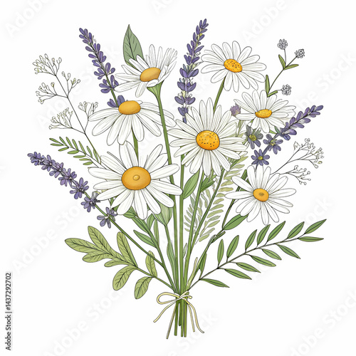 Bouquet arrangement of wildflowers, including daisies, chamomile, and other delicate blooms
