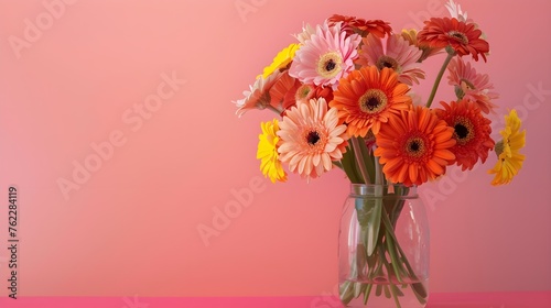 Bouquet of beautiful bright gerbera flowers in glass vase on table against color background. Space for text