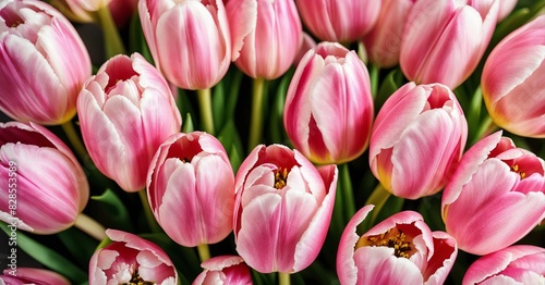 Bouquet of pink and white tulips. Concept: spring, beauty, elegance. For floral shops, greeting cards, celebration campaigns, Mother's Day, weddings, Easter, and floral holidays.