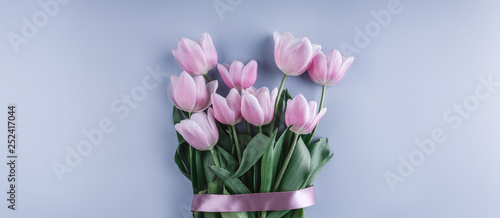 Bouquet of Pink tulips flowers over light blue background. Greeting card or wedding invitation. Flat lay, top view, copy space. Wide composition