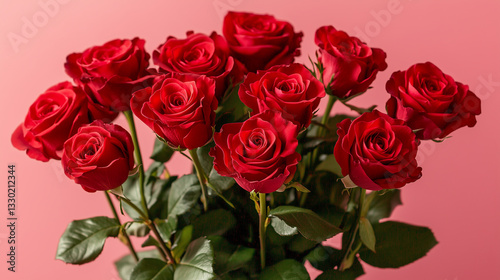 Bouquet of red roses is arranged in a vase on a pink background