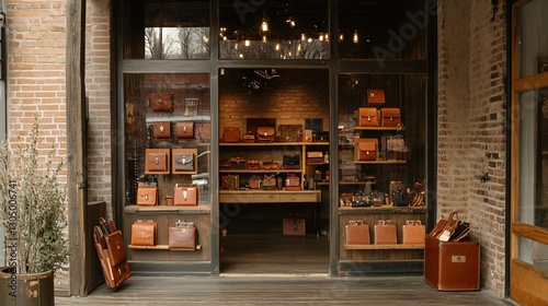leather, bag, purse, handbag, boutique, shop, display, window display, brick building, brick wall, brown, vintage, retro, fashion, accessory, retail, store, small business, craftsmanship, hand-made, artisan, quality, luxury, elegant, window shopping, city, urban, exterior, daylight, sunlight, shadow, texture, detail