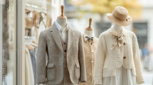 boutique, window, display, mannequin, suit, hat, fashion, clothing, retail, style, apparel, shopping, outfit, showcase, exhibit, accessory, trendy, displayed, design, modern, urban, elegant, visual, dress, tailored, business, casual attire, man, woman, textile, presentation, merchandising, window shopping, showroom