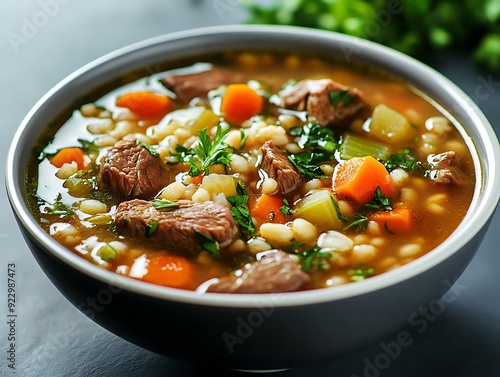 Bowl of Barley Beef Soup with Carrots, Celery, and Parsley - Photo