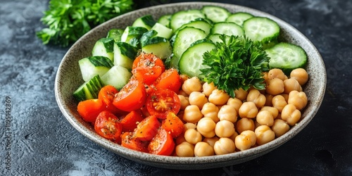 Bowl of chickpeas with fresh diced cucumbers and cherry tomatoes garnished with parsley on a dark textured background showcasing healthy eating