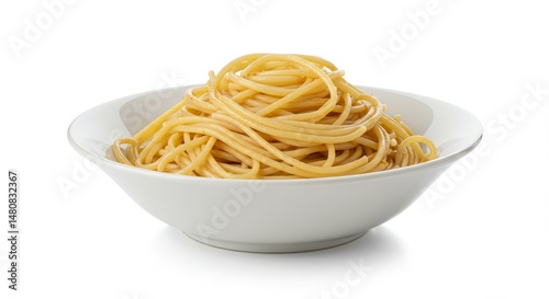 Bowl of Cooked Spaghetti - A close-up shot of a white bowl filled with cooked spaghetti, isolated on a white background