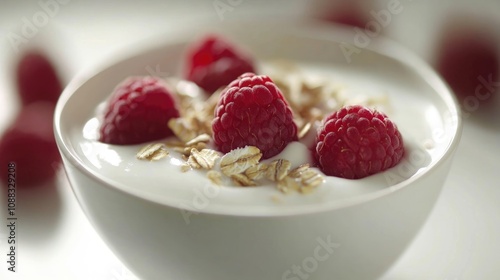 Bowl of creamy Greek yogurt adorned with fresh raspberries and crunchy muesli on a bright white table, ideal for a nutritious breakfast option.