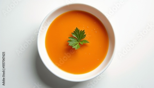 Bowl of creamy pumpkin soup with green parsley leaf on white background