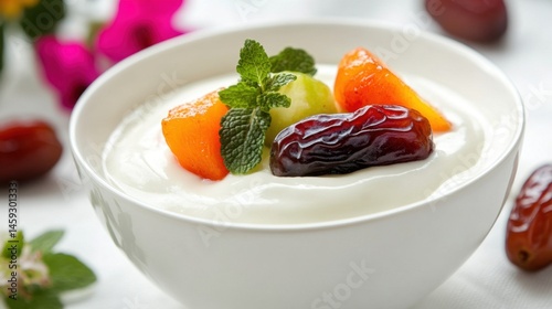Bowl of creamy yogurt topped with fresh fruits and dates on white linen table, natural light
