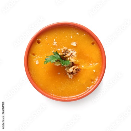 Bowl of delicious pumpkin cream soup with walnut and parsley on white background