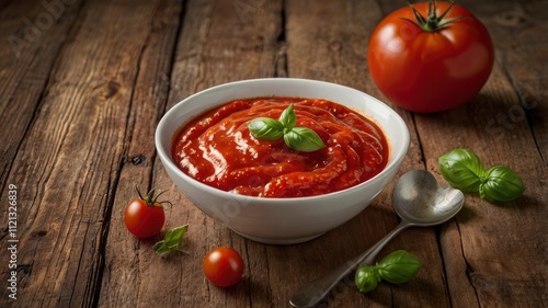 Bowl of fresh tomato sauce on wooden background, close up