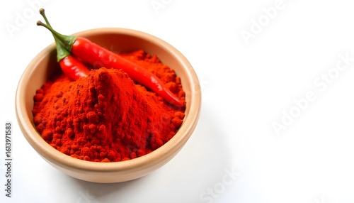 Bowl of Ground Paprika and Fresh Red Chili Peppers on White Background
