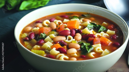 bowl, minestrone, soup, filled, colourful, vegetable, bean, pasta, rich, tomatoes, broth, nourishment, food, wellness, health, nutrient, trend, smooth, technology, minimal, resolution, clean, vibrant, software, advanced, ai, stunning, image, perspective, texture, simulation, synergy, stability