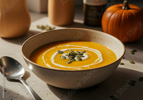 Bowl of Pumpkin Soup Topped with Seeds and Cream for Dinner