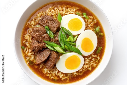 ramen, bowl, beef, egg, noodle, broth, soup, asian, cookery, food, dish, meal, protein, healthy, japanese, comfort, delicious, spicey, savoury, tasty, hot, fresh, cooked, lunch, dinner, image, closeup, top, view, white, plate, pale, brown, green, spring, onion, soft, tender, yolk, eatery, simple, classic, comforting, ready, eat