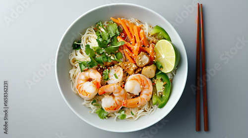 shrimp, noodle, bowl, lime, vegetable, herb, chopstick, asian, food, fresh, delicious, meal, seafood, cookery, tasty, lunch, dinner, epicure, healthy, oriental, dish, cooking, lifestyle, traditional, authentic, receipe, exotic, culinary, protein, nourishment, homemade, modern, eatery, concept, preparation, decorated, gastronomy, kitchen, diet, elegant, appetising, cultural, fusion