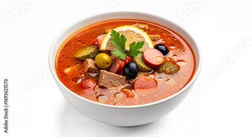 Bowl of solyanka soup with meat, pickles, olives, lemon, and parsley, isolated on white background
