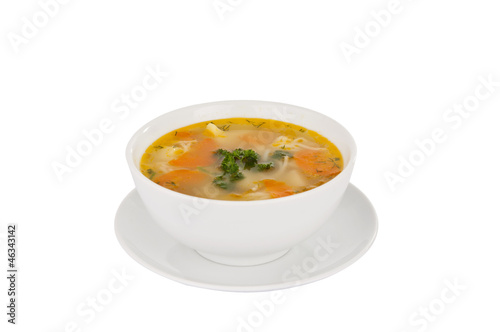 bouillon, bowl, carrot, chicken, clear, colours, contrast, dinner, eating, food, freshness, garnish, healthy, heat, image, isolated, lunch, meal, meat, nobody, noodle, parsley, photo, plate, soup, state, vegetable, vegetarian, white, yellow