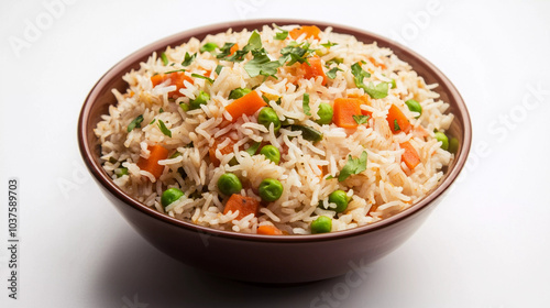 Bowl of steam cooked rice with vegetables isolated on white background, veg pulao