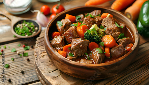 Bowl of tasty beef stew and fresh vegetables on wooden table background