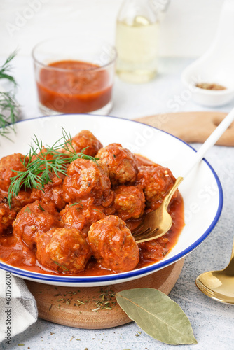 Bowl of tasty meat balls with tomato sauce and dill on white background