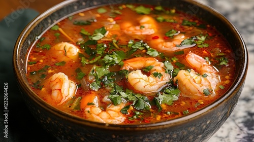 Bowl of Thai tom yum soup with shrimp, lemongrass, and vibrant herbs, aromatic and spicy