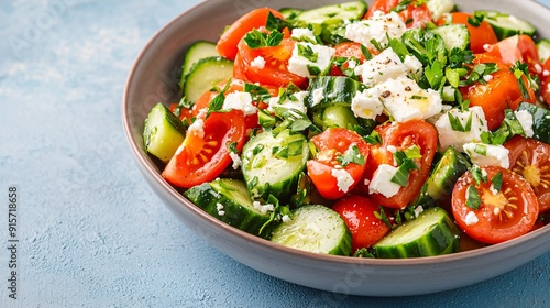 Bowl of tomato and cucumber salad with feta cheese and herbs refreshing nutrient rich low calorie dish
