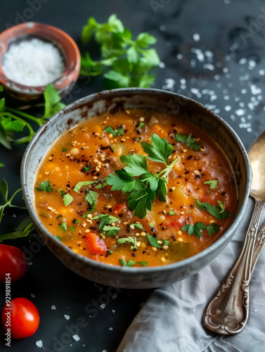 bowl of tomato soup, garnished with fresh parsley and quinoa, is the epitome of comfort food. The vibrant colors and rustic presentation